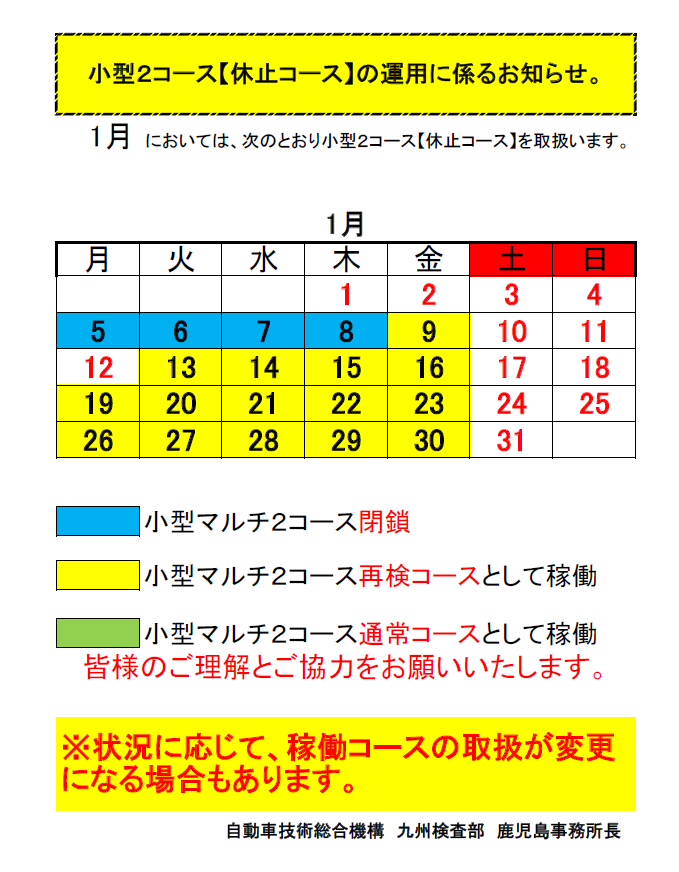 独立行政法人自動車技術総合機構九州検査部鹿児島事務所より、1月の小型2コースの運用につきまして、下記の通り通知がありましのでお知らせいたします。