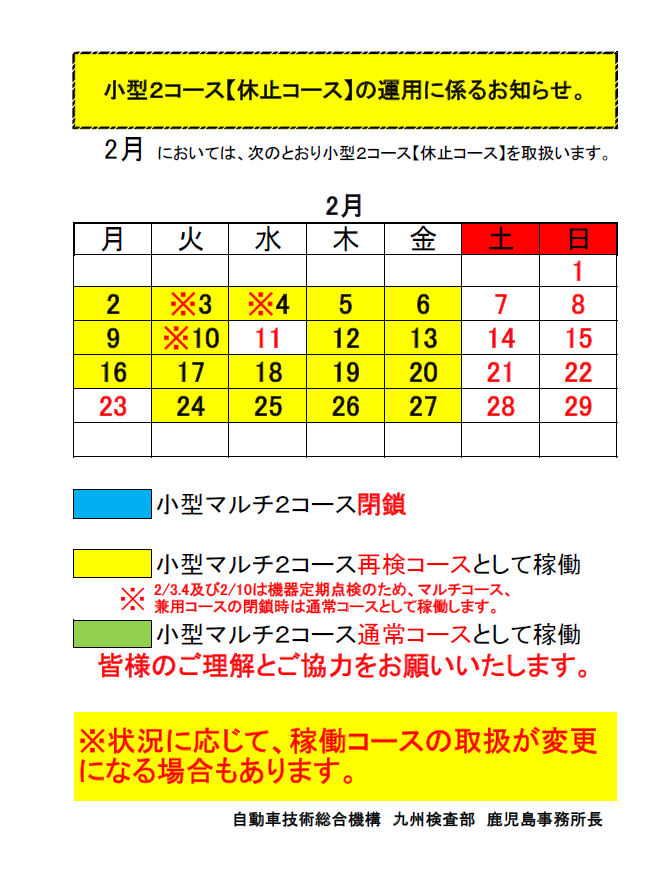 独立行政法人自動車技術総合機構九州検査部鹿児島事務所より、2月の小型2コースの運用につきまして、下記の通り通知がありましのでお知らせいたします。